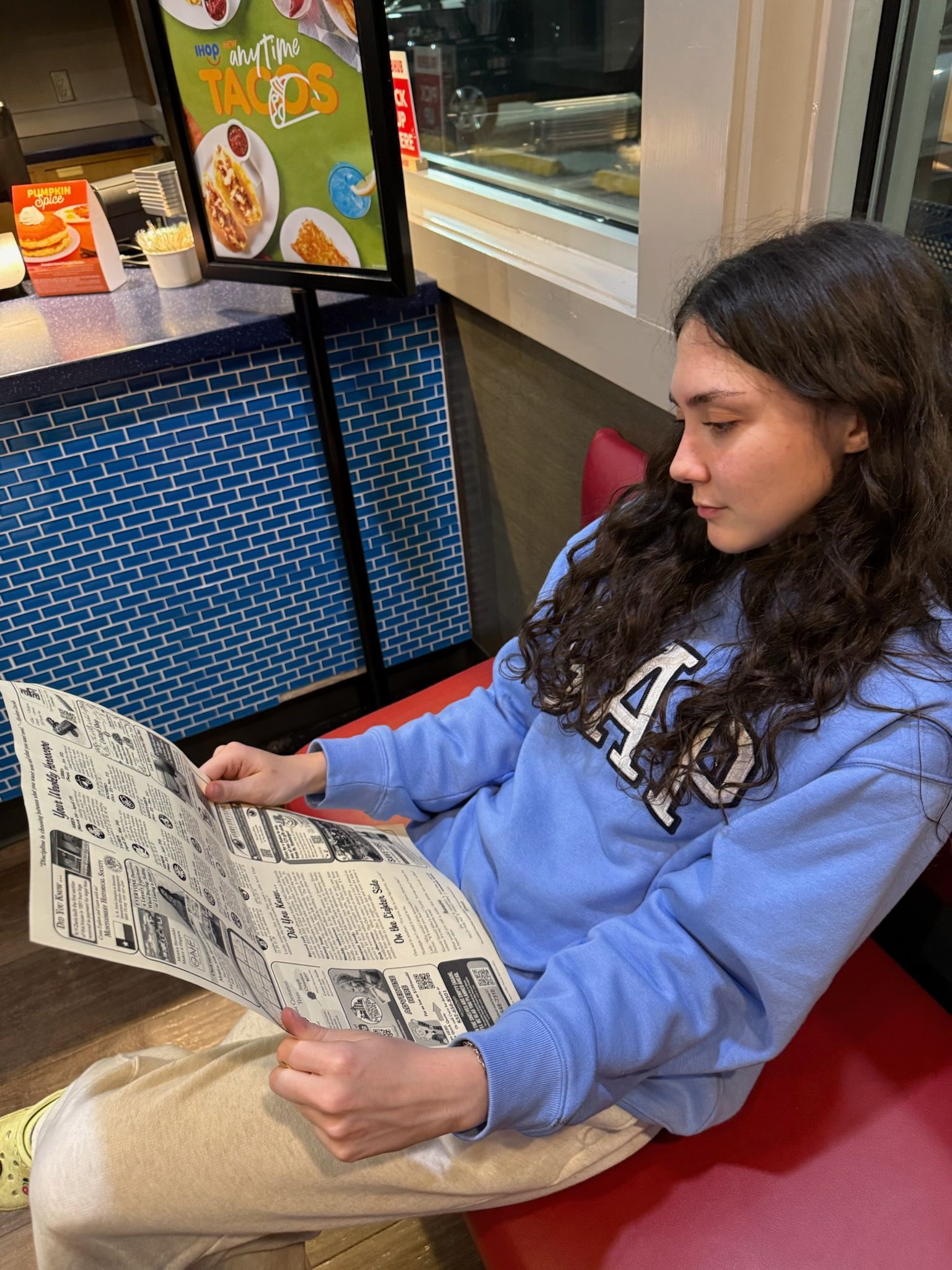 Kilani reads Coffee News while waiting for her food at Magnolia Diner